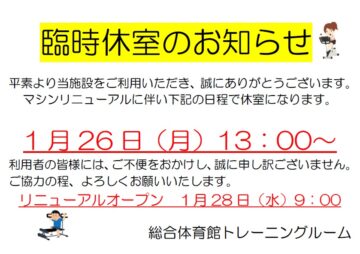 【川越運動公園総合体育館トレーニングルーム】1/26(月)13時~終日 臨時休業のお知らせ 運動公園2026.01.09 日頃から施設をご利用いただき、ありがとうございます。 川越運動公園総合体育館トレーニングルームは、マシンリニューアルに伴い、以下の日程で臨時休業いたします。 利用者の皆様にはご迷惑をおかけいたしますが、ご理解とご協力をお願いいたします。 令和8年1月26日(月)13時~終日 ※1/28(水)9時からリニューアルオープンいたします。 【問合せ】 川越運動公園総合体育館 049-224-8765(休館日:火曜日、祝日の場合は翌日)
